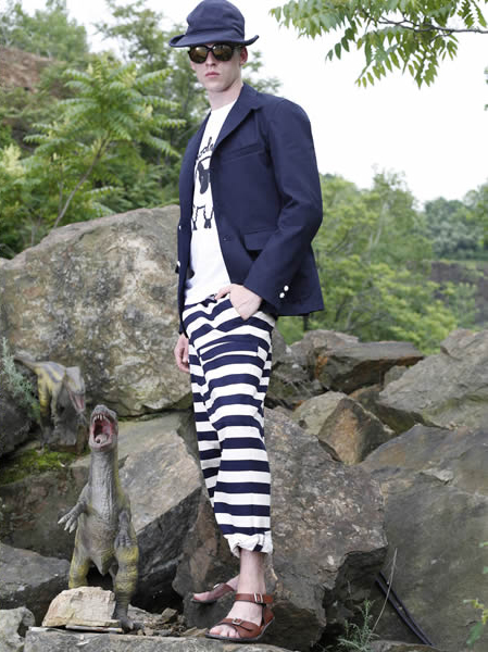 Now we’re talking. That jacket is liquid murder. The formal navy, the contrast buttons and the stupid sheep T-shirt – that shit’s saying, “don’t you even try to control me bitches, if I want to watch a Lifetime Movie about a multiracial foursome that results in jealousy and regret for all parties, I fucking will.” The struggle-a-like-Vans and the 1970’s curtain slacks can do one.