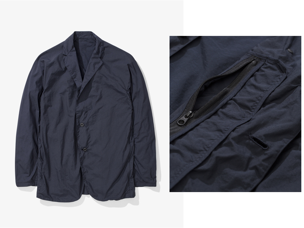 At first glance this nylon blazer appears reasonably unexceptional. Navy, unstructured, a little rumpled; a wardrobe essential certainly, but hardly grandstanding. Look closer though and you’ll find the outward chastity belies some interior wildness.