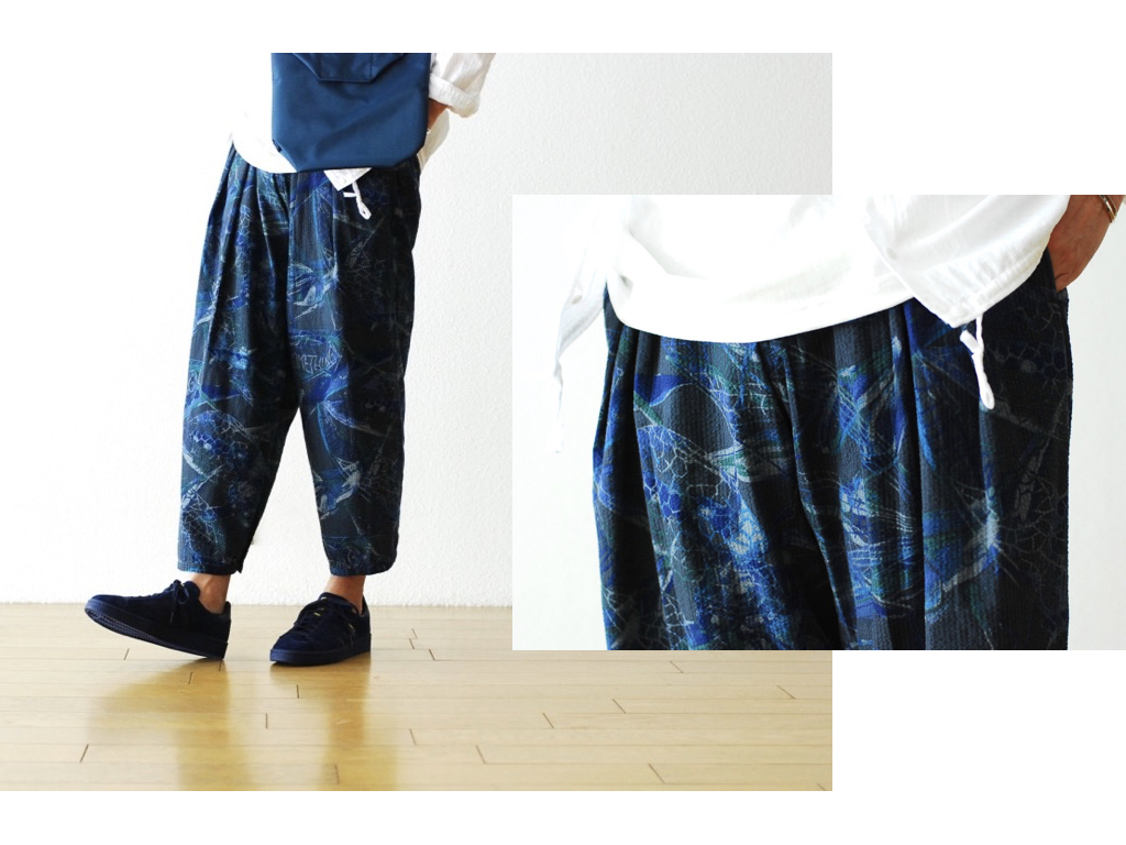According to Google Translate’s attempts, these trousers are pattered, “with a calm hue of the whole big bug insect.” It could have said, “comes with two free pints of top quality yum“, and it would have made as much sense. I can’t see bugs or insects, big or otherwise. What I can see is a pair of large, pleated trousers, seemingly in some kind of printed seersucker – the pleasures of which we discussed just a few days back.