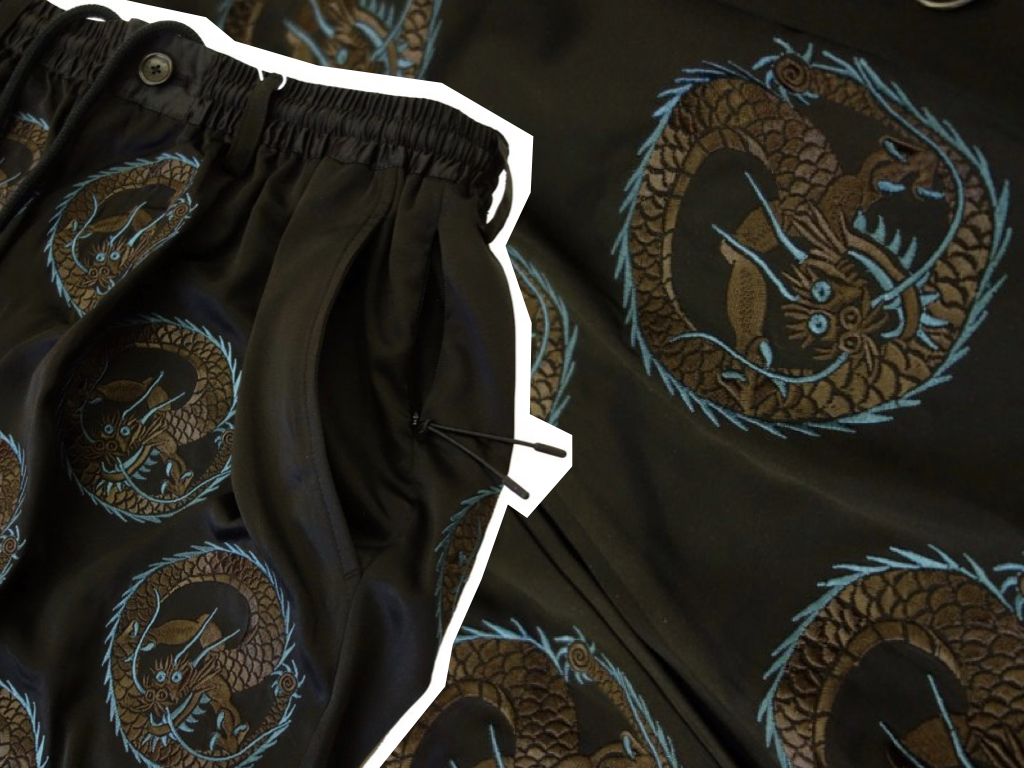 Maybe my enjoyment of Cobra Kai has concussed my taste. If I think about it, while I appreciate the shape of the garments, and I do love loose-fitting, unlined suiting, I don’t think I can get past the dragons. It’s a pity, because there are some great details hidden behind that patterning. On the jacket there are diagonal pockets like a coach jacket and there’s a button at the rear of the collar to make it easy to wear standing up like a blazer, or flat like a shirt. The elasticated trousers are loose with a subtle taper and feature mini-zipped pockets so you won’t lose your keys.