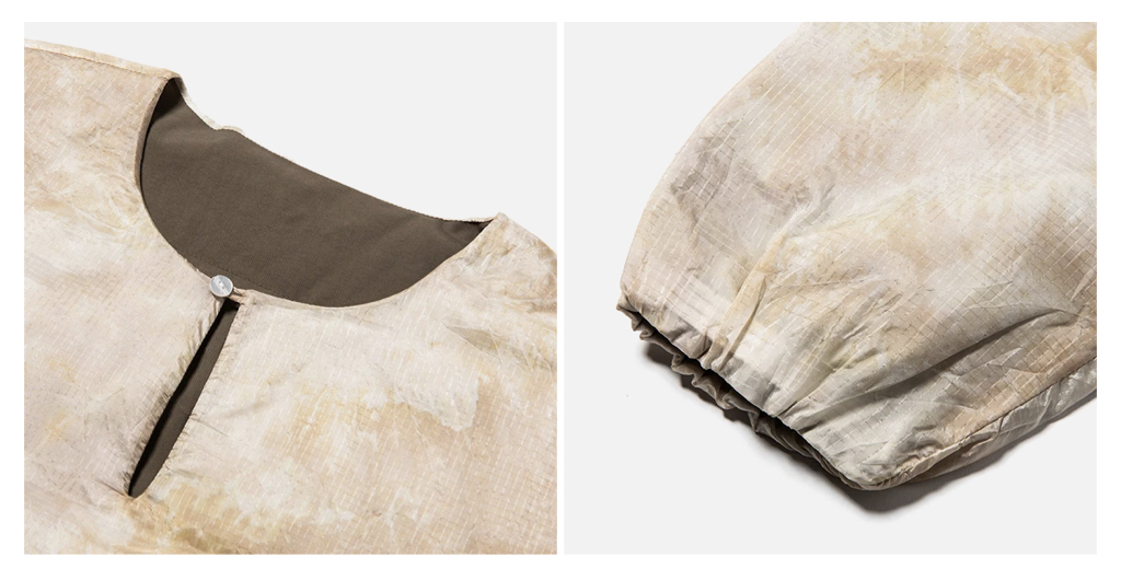 If you’re not buying into this rampant pottiness don’t worry, check out the above: it’s a reverser. While looking like a walking stain has its own strange appeal, on balance I think I prefer the more conservative side — flat, rather than smeared, brown, with three, let’s call them ‘action stripes’ across the midriff. A cool alternative to a generic knit I think. Shame there’s only one shot of this over on the Meanswhile site.